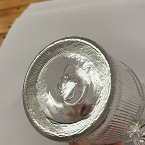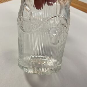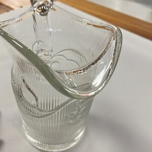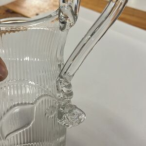 Beautiful clear glass pitcher with a ribbed design. Press glass vintage sandwich tulip marked MMA for Metropolitan museum measures 8 inches tall and 8 1/2 inches across the handle to spout in great condition.