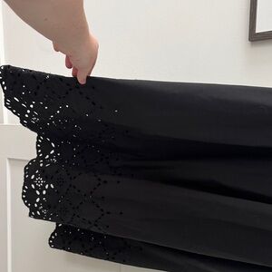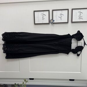 Elegant black maxi dress. Features intricate lace details. Perfect for any occasion.