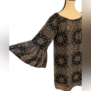 Chic off-shoulder dress with elegant patterns. Ideal for casual wear. Fully lined. Beautiful bell sleeves.