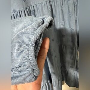 Flowy and feminine, this Blu Pepper dress features a soft dusty blue color with textured jacquard polka dots. Designed with a flattering V-neckline, long sleeves with elastic cuffs, and a tiered babydoll silhouette that offers comfort and effortless style. Perfect for casual outings, layering with boots and tights in fall, or wearing with sandals in spring.