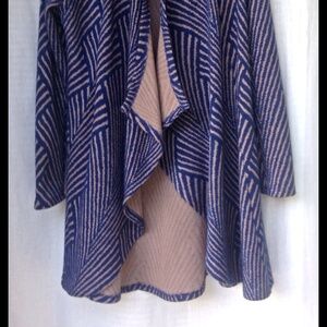 Stylish open-front sweater. Features bold blue and tan pattern. Perfect for layering.