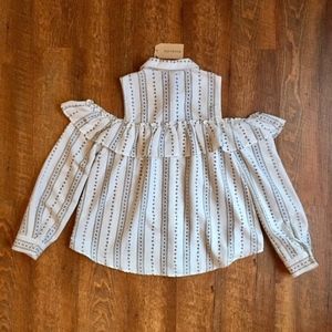 Blu Pepper Collared Button Down Striped Floral Ruffle Cold Shoulder Top Large
