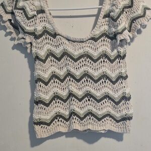 Elegant knit top with intricate design. Soft cream and gray hues.