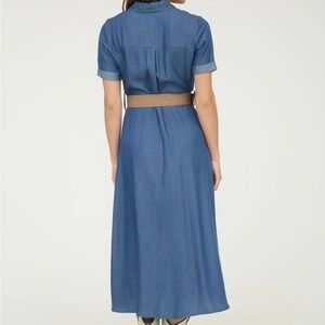 Stylish denim blue midi dress with button-down front. Features a chic tan belt for added flair.