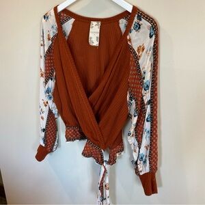 Blu Pepper Fall Boho Faux Wrap Top Orange Floral Womens Small Tie Waist V Neck