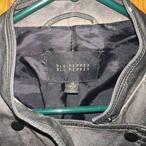 Blu Pepper Faux Leather Moto Jacket, Medium, in excellent condition. This stylish grey-black biker jacket features an asymmetrical zip closure and snap details on the collar. Double zippers on the sleeves and two front zip pockets add to the classic moto aesthetic. Crafted from faux leather, this jacket offers a cool, edgy look perfect for casual wear or dressing up an outfit. No stains, rips, or tears.