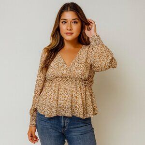 Preloved Blu Pepper floral peplum blouse in white, tan, and gold tones. Features a feminine V-neck wrap bust, elastic ruffle waist, and flowy peplum silhouette for a flattering fit. Lined body with puff long sleeves and elastic cuffs. Lightweight and perfect for cottagecore, boho, or fall layering looks.