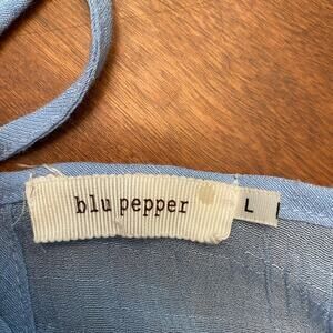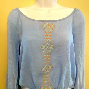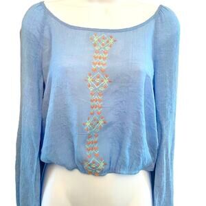 Blu Pepper Cropped Long Sleeve Light Weight Blouse size Woman’s Large Blue with Embroidery. Elastic waist and sleeves and tie back.