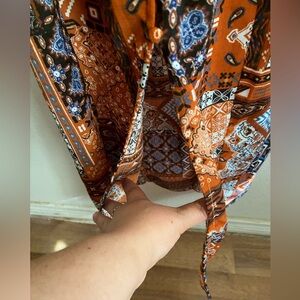 This Blu Pepper sundress is perfect for casual and resort wear, featuring a striking backless design with spaghetti straps. The dress showcases a beautiful blend of brown and orange tones, ideal for warm weather outings.