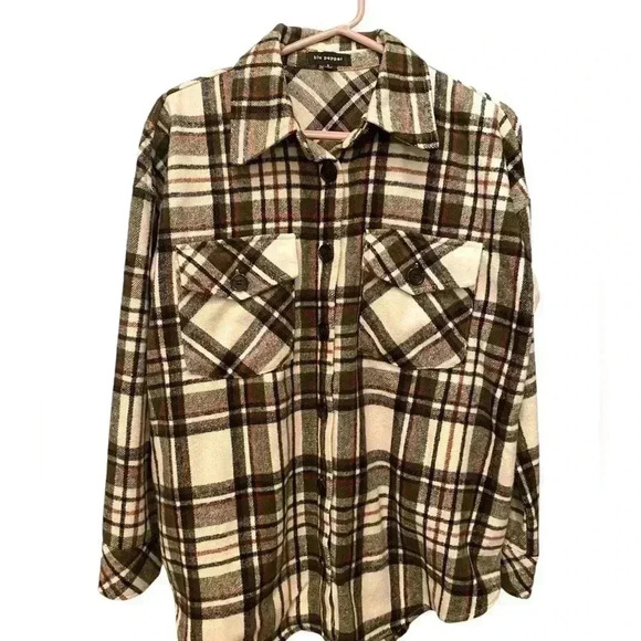 Available in a size small, this shacket is a must-have for any fashion-forward woman. The beige, brown, and green color combination is perfect for any season, whether it be winter, fall, or spring. The jacket is designed with a hipster, dad, outdoor, and city theme, making it a perfect addition to any wardrobe. Get your hands on this stylish and comfortable Blu Pepper Plaid Flannel Shacket Shirt/Jacket today!