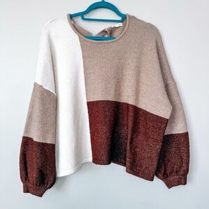 🧵 Details: Good gently worn condition, super soft, oversized, pull over sweater, round neckline, has a tie string on the back, color block print