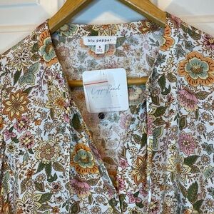 Blu Pepper Sz S Floral Bohemian Burton Blouse - Cream & Brown Balloon Sleeves