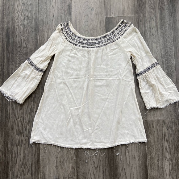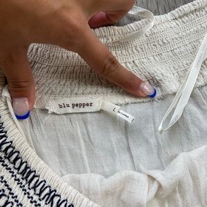 White with Navy Embroider Blu Pepper Off the Shoulder Top. Size L. Excellent used condition.