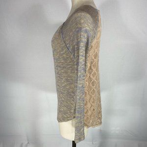 Women's blue & tan v-neck knit sweater. Open loose knit construction, long sleeves, pullover styling. Lightweight, breathable, semi-sheer.