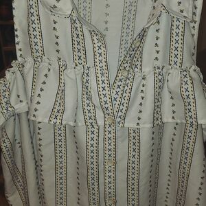 Stylish off-shoulder blouse. Features blue and yellow stripes. Button-down front. Perfect for casual wear.