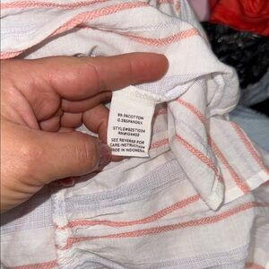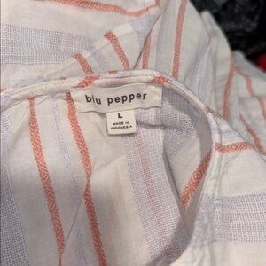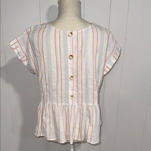 Chic peplum blouse with white and pink stripes. Soft fabric and stylish design. Perfect for casual outings.