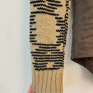 Blu Pepper Women’s Knit Cardigan Brown Aztec Print Size Small. Cute and cozy cardigan, open front (no buttons or zipper), detail tabs that look like pockets but are not pockets, knit sleeves. Self = 100% rayon. Contrast = 100% acrylic. Approximate measurements laying flat: armpit to armpit = 17.5” and length from shoulder to back hem (front is longer) = 21”. Used, but in great condition. No stains, holes or other major damages.