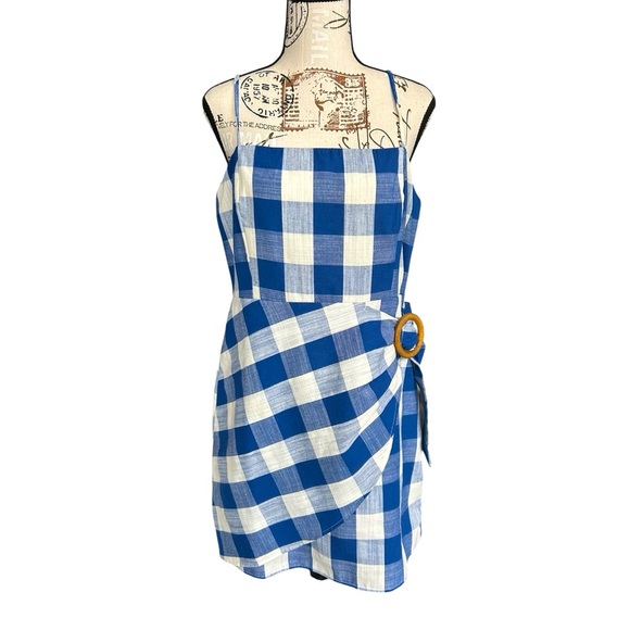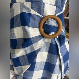 BLU Pepper 55% linen and 45% cotton blue and white large checkered sundress with front wrap skirt and round wood buckle. Adjustable spaghetti straps and gorgeous cotton lining.