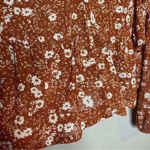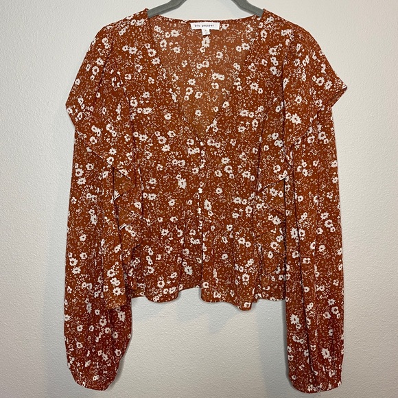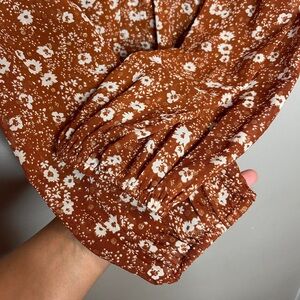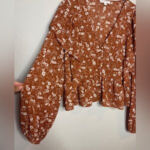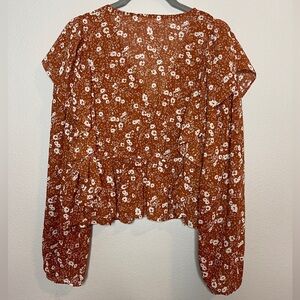 Blu Pepper sienna brown blouse with floral and gold accents. Balloon sleeve perfect for fall with a pair of jeans.