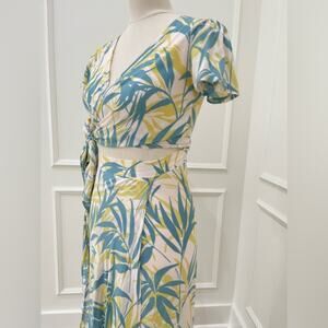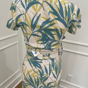 New with tags, tag is still attached to the skirt but came off the top. The top is cropped with an adjustable full wraparound tie, and the skirt is high waisted, leaving the perfect peekaboo midriff skirt sips in the back, and there is a loose thread on back below zipper as pictured. Size is small, tight and form fitting.
