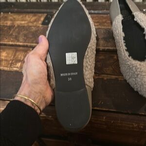 Step into comfort with these stylish gray / tannish half shearling half leather slip ons