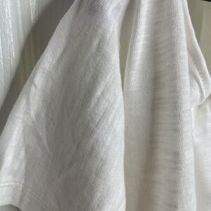 BluHeaven White Cotton/Poly tunic with a slit at the bottom, and open shoulder detail. It is a bit on the sheer side and washes well.