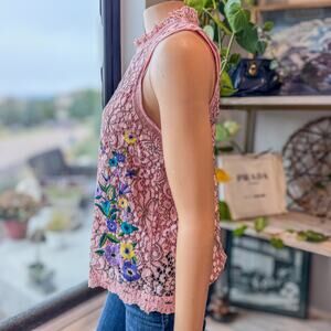 BluHeaven Pink Floral Embroidered Lace Sleeveless Top High Ruffled Neck, Small