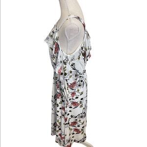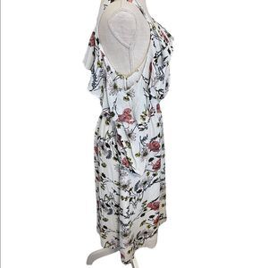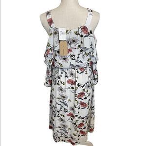 Adorable Blu Pepper Floral Dress. New with tags. Dress has straps with a open cut/hole in sleeves (cold shoulder). Lovely Farm house style dress. Keyhole closure on back. Elastic cinched waist. Lined. White with peach and lime floral details. Light gauzy material. Size small.