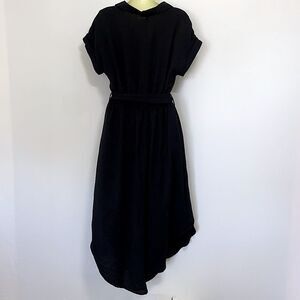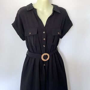 BY BLU PEPPER MINE, SOLD AT NORDSTROM, HERE IS A WONDERFUL 100% POLY MIDI DRESS. IT IS BLACK AND FEATURES A TEN BUTTON DOWN FRONT. THE THREE BUTTONS ARE FUNCTIONAL ABOVE THE ELASTIC WAIST.IT IS COLLARED WITH SHORT FOLD SLEEVES. THERE ARE TWO BREASTPLATE POCKETS WITH BUTTON CLOSURES.THE MATCHING BELT HAS A WOVEN BEIGE BUCKLE. NEW WITH TAGS SIZE MEDIUM, PLEASE NOTE THE MEASUREMENTS