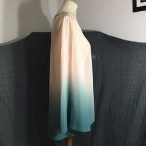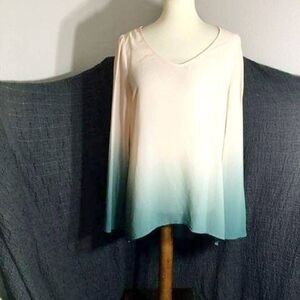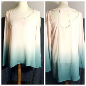 Cream and soft teal fading ombre effect long sleeve top. Modest V-neckline. Cut out pick-a-boo back detail. Semi-sheer top. Longer on the back than the front. A couple of untreated spots as pictured ( barely visible might be hard to see). Pre-owned in overall good condition. Please refer to pictures for best description and condition verification .