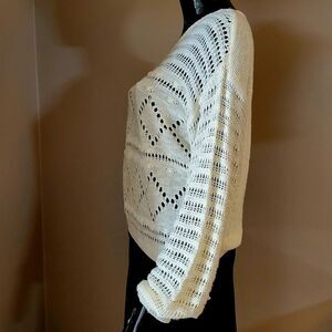 Lightweight acrylic sweater with an intricate open knit design. Scoop neck with a bishop sleeve. Size Small. Bought but never worn.