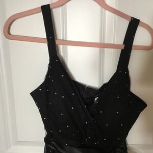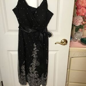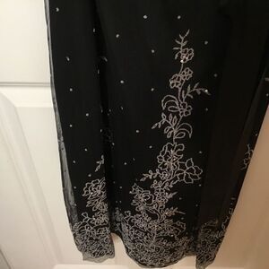 Blu Sage brand Women’s gorgeous black and silver formal dress. Spaghetti strap, Sleeveless, 2 layers. Inner layer is black crepe polyester, outer layer is polyester tulle accented with silver beading in a beautiful floral pattern which covers front and back. Built in bra, satin taffeta ribbon at waistline. Fiber content and care information shown; size tag is missing so please check out these measurements: Bust is 46”, waist is 46” and hips measure 48”.. Overall length from shoulder center of spaghetti strap to hemline is approx. 43 1/2”. Showing photos of front and back sides.