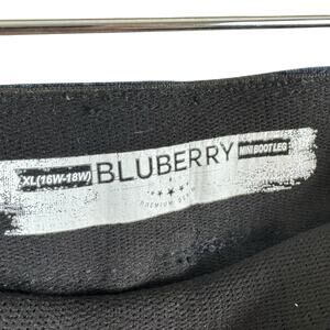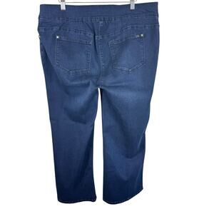 Excellent preowned condition. Bluberry Dark Wash Cotton Blend Elastic Waist Pull On Boot Cut Jeans. Faux pockets on front/open pockets on back. Cotton/polyester/viscose/spandex material. Approx. measurements: Waist 38", inseam 27", rise 11.5". Size XL (16W-18W).