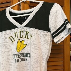 Green V-neck tee with Blue 84 branding. Comfortable and stylish.