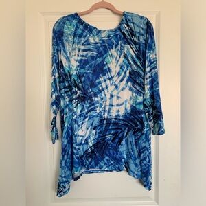 Blue Abstract print top with round neckline. Material made from rayon and spandex blend. Size XL.