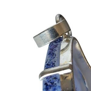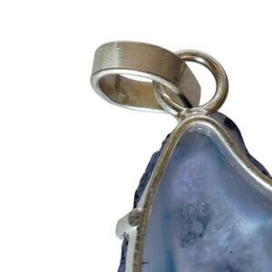 This handcrafted pendant showcases a stunning 3-inch blue agate slice, with a natural crystalline center and subtle concentric banding in icy blue and violet tones. The organic edge and raw texture are preserved and secured in sterling silver prongs, giving the piece a sculptural, elemental beauty. Each agate slice is unique, formed over millennia and selected for its translucent layers and inner crystal detail. The soothing blues evoke a sense of calm and clarity, making this pendant a perfect gift for crystal lovers, spiritual jewelry collectors, or anyone who values bold, natural design. Suspended from a 20-inch sterling silver chain, this one of a kind pendant is artisan made in a small studio with care and intention.