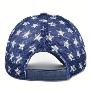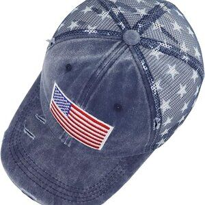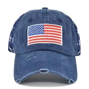 Blue American Flag Star Trucker Cap-Washed Distressed USA Embroidery- Adjustable