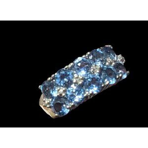Elegant double-row silver tone ring featuring blue and clear gems. Perfect for any occasion, this size 5 3/4 ring adds a touch of sparkle to your look. Ideal for everyday wear or special events.
