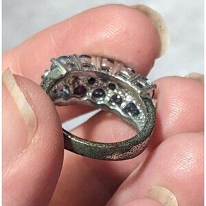 Moderate wear and some verdigris on the band, on the inside, sides, and outsides. All gems are in tact and seem to be undamaged.