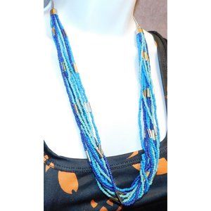 Gorgeous Bohemian style blue and silver necklace. The back of the necklace has plain silver tone chain, with a lobster clasp. The front and sides of the necklace are made from 12 individual strands of glass seed beads in dark blue, medium blue, and turquoise beads with silver tone cylindrical accent beads. This is a wonderful necklace, with beautiful cool tones. Perfect for Bohemian and hippie outfits!