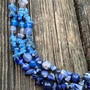 Triple strand blue tone necklace. Necklace is Sodalite stone in center, dyed blue agate and light blue chalcedony with hint of taupe by button clasp. Stones are different shapes and sizes. Necklace is 21 inches long.