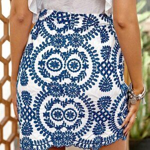 Blue And White Boho Womens Allover Print Scallop Trim Skirt