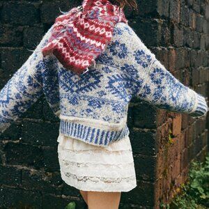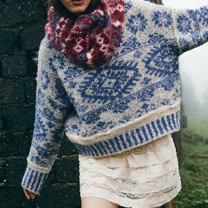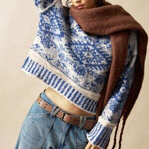 Stay cozy in this blue and white fuzzy sweater, perfect for late fall. Its loose fit and long sleeves ensure a comfortable wear, while its regular length makes it versatile for various occasions.