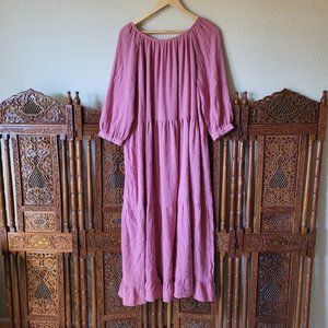 Soft, airy, billowy, floating cotton/linen dress from sustainable indie designer out of Spain, Blue Anemone. Really lovely lightweight gauze dress with French puff sleeves, open waist and hips, tiered skirt, tassel detail, and fully functional buttons. It's a wonderful prairie/bohemian style that lends itself towards modest dressing, sun protection, or even maternity/breastfeeding wear.