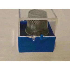 This is a pre-owned Blue Angels thimble. It is made of metal and has a silver finish. The thimble is approximately 1 inch in diameter and 1 inch in height. It features a design of the Blue Angels logo on the top. The thimble is in good condition with minor signs of wear. It comes in a clear plastic box with a blue base. The box is approximately 2 inches in diameter and 2 inches in height. The thimble is a great collectible for any Blue Angels fan.