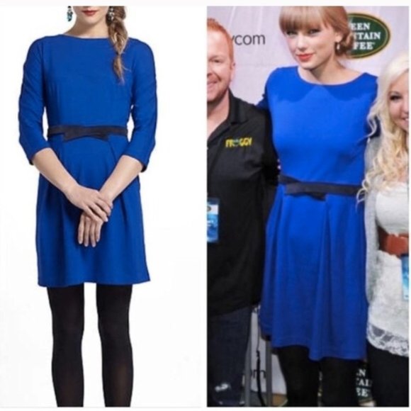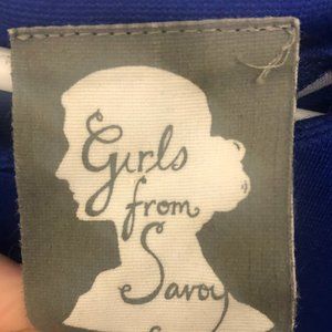 This gorgeous Blue Ponte knit Anthropologie dress by Girls From Savoy with velvet black belt has barely been worn.