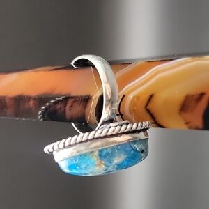 Elegant women's ring featuring a striking Blue Apatite gemstone set in a 925 silver plate band. Stone measures 17mm x 23mm. Perfect for adding a touch of sophistication to any outfit.