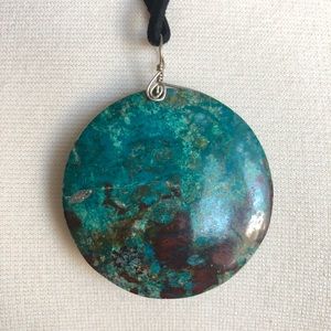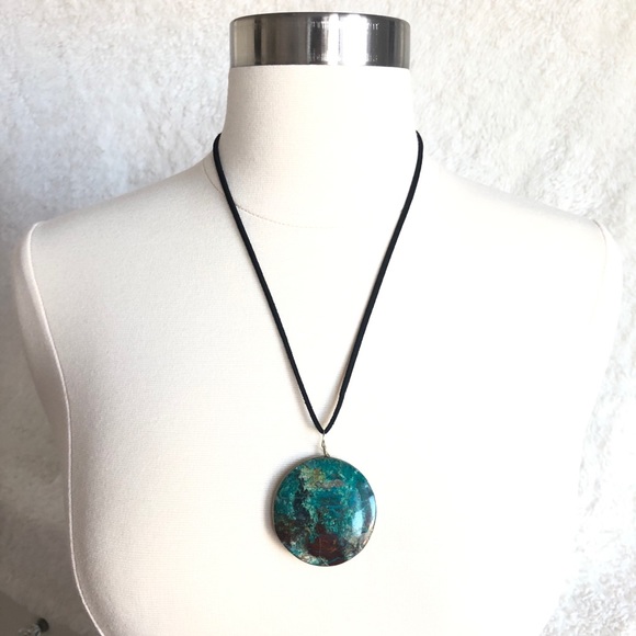 Beautiful blue apatite stone pendant necklace with black suede cord and lobster clasp closure. Blue Apatite is a stone of manifestation, inner clarity, and insight.
