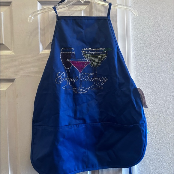 Stylish blue apron featuring a rhinestone cocktail design. Perfect for cooking or entertaining.