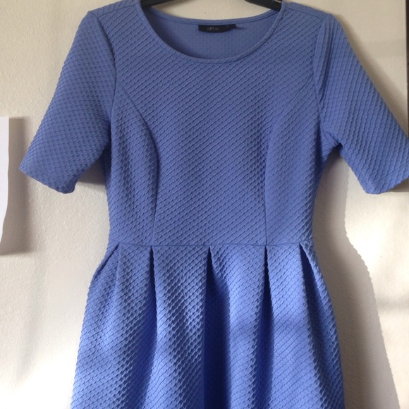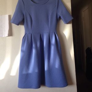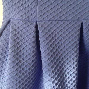 Soft blue colored dress slightly pleated and has a subtle textured pattern. Size small but also fits medium(like me). Has pockets on the sides! Worn once.